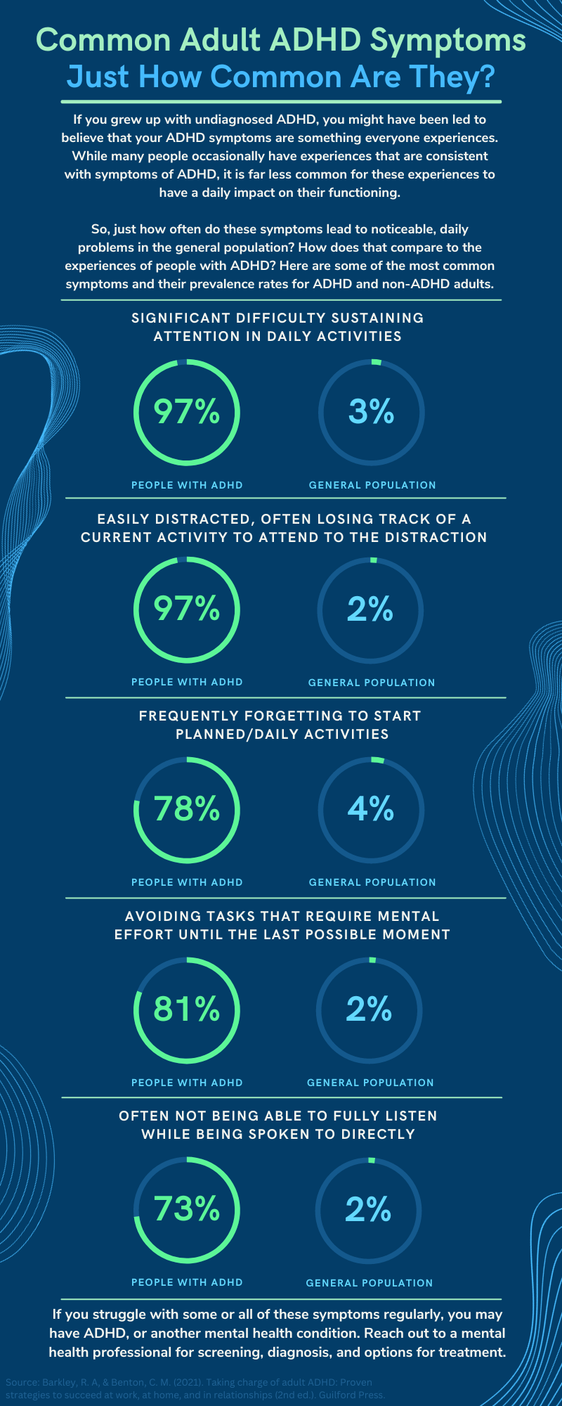 If you have lived with ADHD symptoms up to this point in your life without recognizing them, you may have a very difficult time identifying them as symptoms. Here is an infographic to help you visualize how prevalent some of those symptoms are in adults: